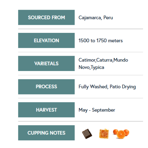 A single origin coffee bean grown in Cajamarca, Peru at altitudes of 1500 to 1750 meters. Medium roast profile.